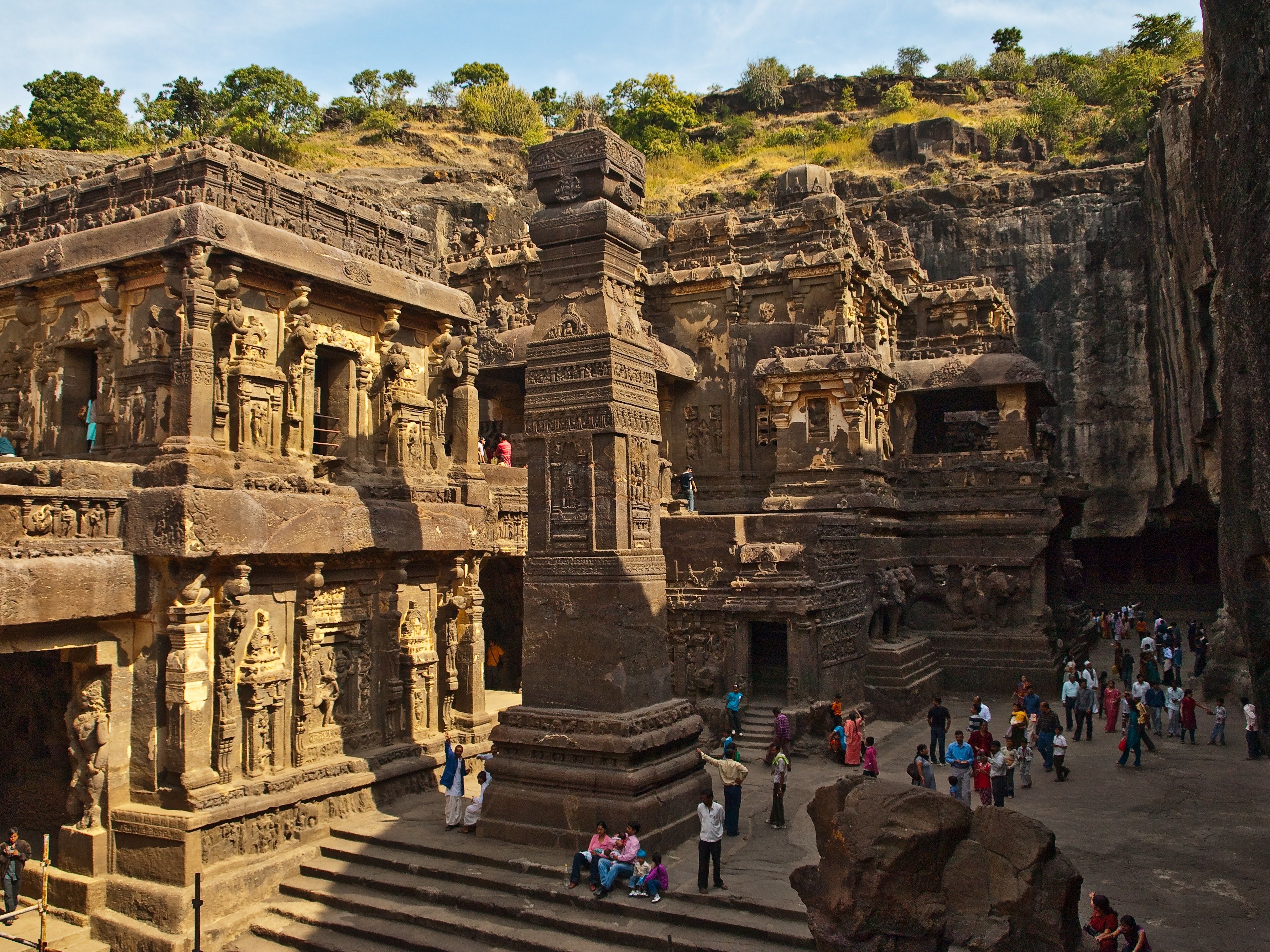 The Kailasa Temple is one of 100-odd rock-cut cave temples and monasteries at Ellora (Verul to the locals), around 30 km north-west of Aurangabad in Maharashtra. Collectively called the ‘Ellora Caves’ – one of the largest religious cave complexes in the world – all the caves are sculpted into a basalt cliff-face and spread across a 2-km area. However, only 34 of them are accessible to the public. These shrines and monastic complexes, which boast beautiful figures and motifs intricately carved into stone, comprise 12 Buddhist caves, 17 Hindu temples and 5 Jain temples built between 600 CE and 1000 CE.