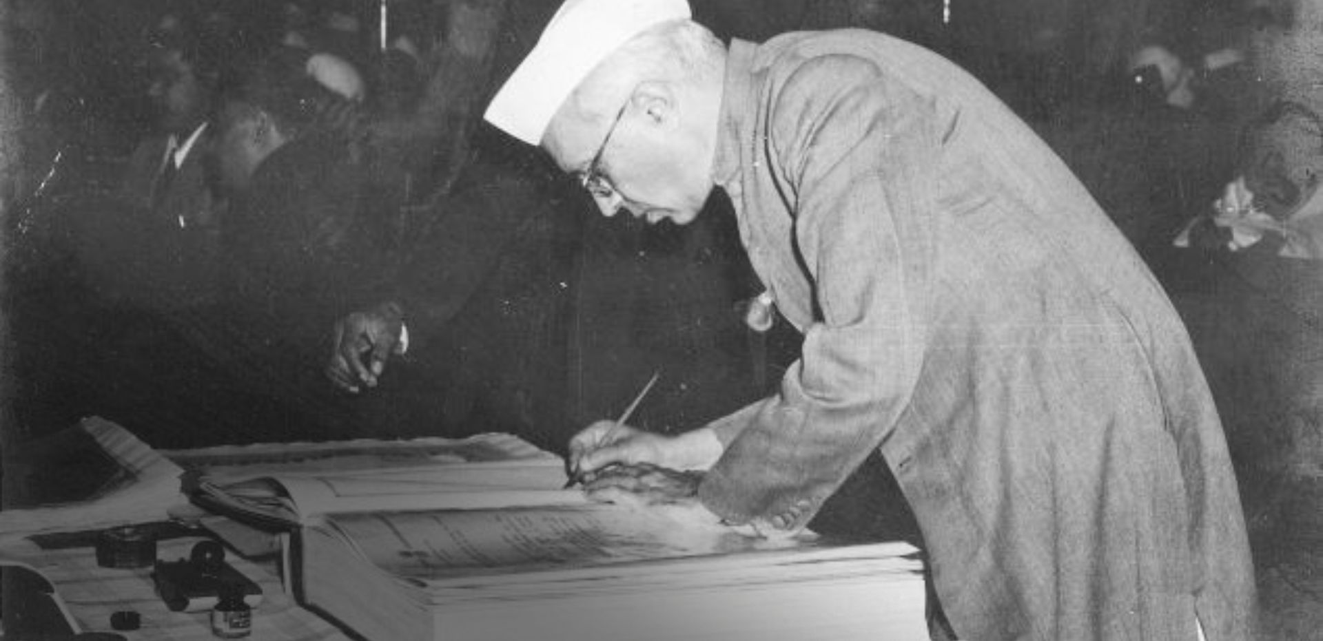 On 24th Jan 1950, members of the Constituent Assembly signed the English copy of the Constitution. It was handwritten by calligraphist Prem Behari Narain Raizada and illustrated by a team led by artist Nandlal Bose.