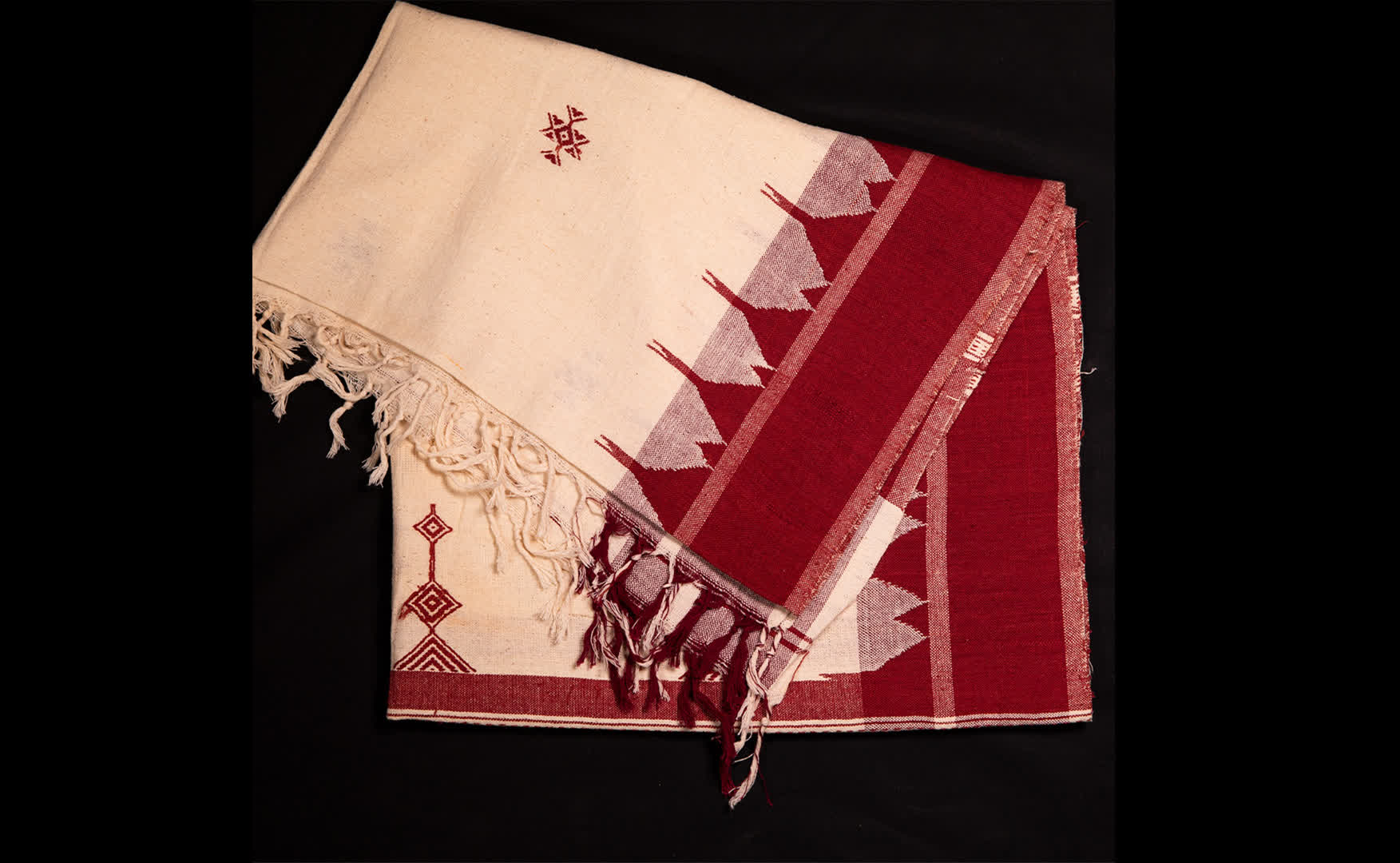 Shades of red like scarlet, maroon and dark brown, along with off-white are the dominant colours used in the Kotpad weave. Traditionally, Kotpad weavers make saris or pata, gamcha (upper cloth) and tuval (lower garment worn by men). However, today, dupattas and stoles are also made. Kotpad saris come in a great variety, based on the ritual occasion for which it is made and the wearer.