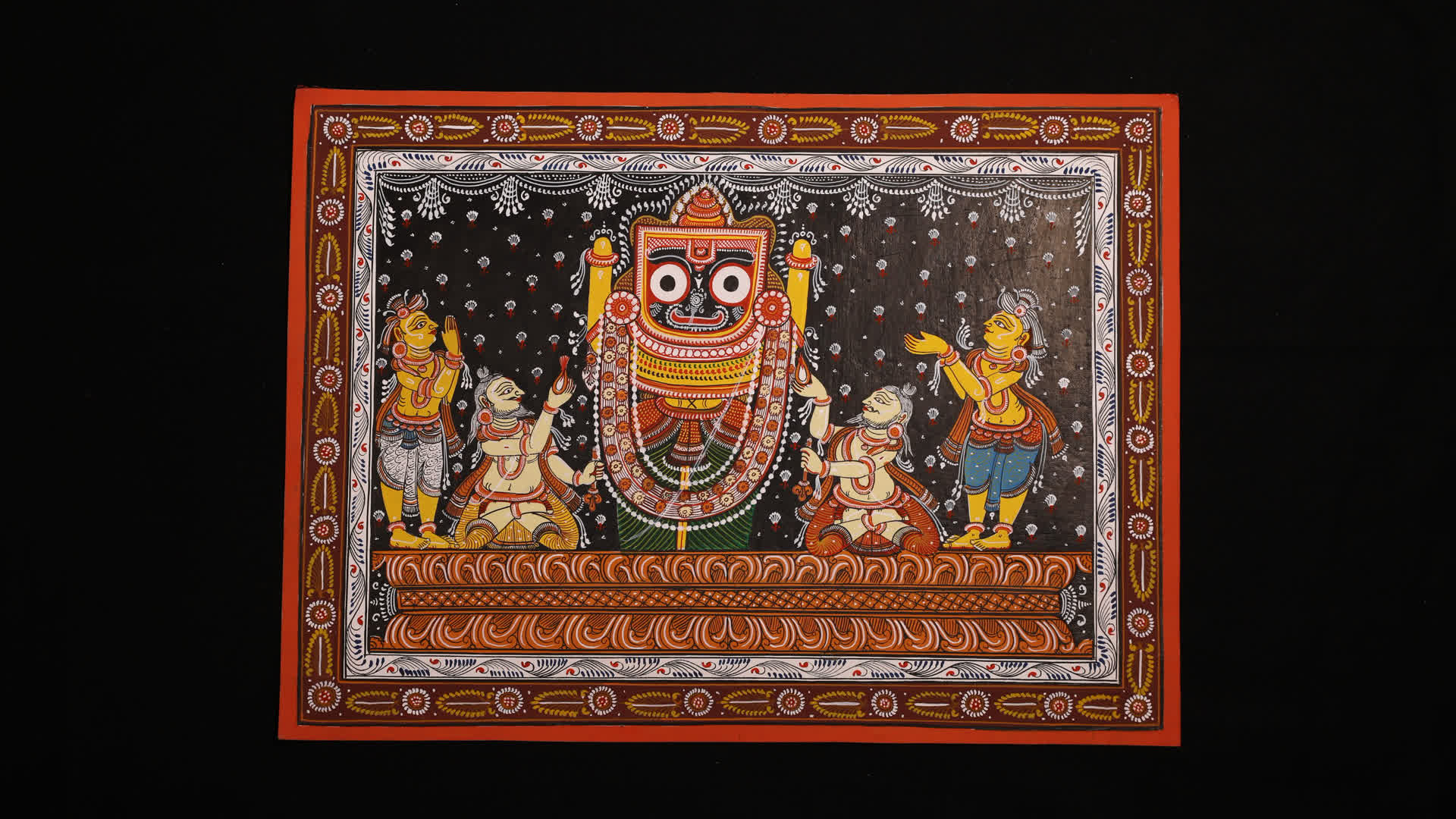 The main subject of Pattachitra paintings is the local deity Jagannath, and this art is mainly associated with worship and rituals. In the art, like in the temple, the Lord is represented in a totem-like appearance, along with his brother Balabhadra and sister Subhadra. These deities are represented icononically in black, white and yellow, respectively. Pattachitras representing the Jagannath deity are known as Srikhetra Pati. The iconic face of Jagannath is also full of symbolism. The two large eyes represent the sun and the moon. Associated with the universe, he is regarded as Anandi, having no beginning, and Ananta, without end.