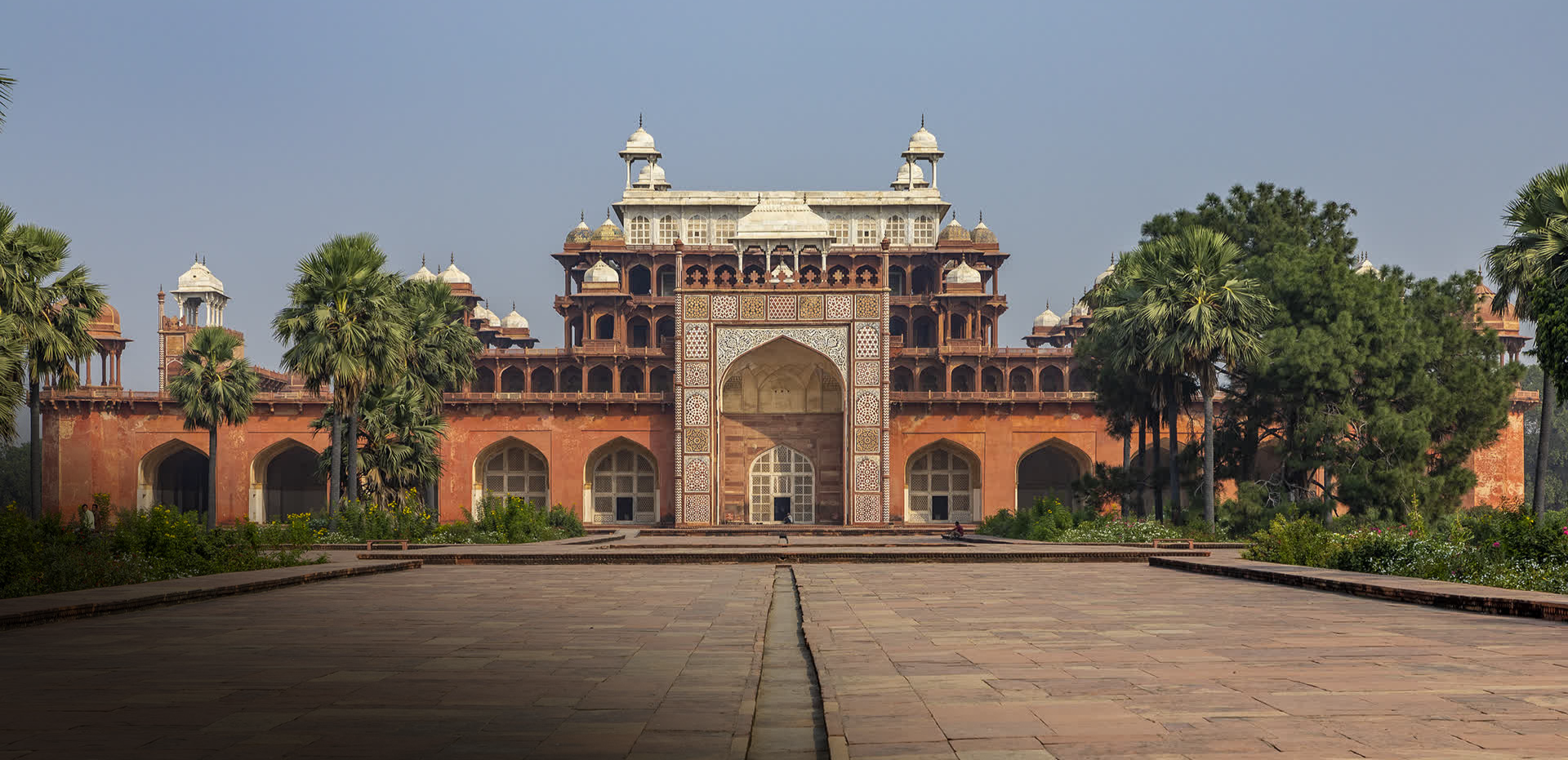 The mausoleum, which was completed in 1612-13, rises to a height of about 100 feet, diminishing in size with each level. It is built largely of red sandstone but the top storey is clad in white marble. Jahangir built a magnificent gateway to the north of the complex, with four unusually slender marble minarets. Through the gate one enters a typical Mughal char-bagh, at the centre of which lies Akbar’s tomb.