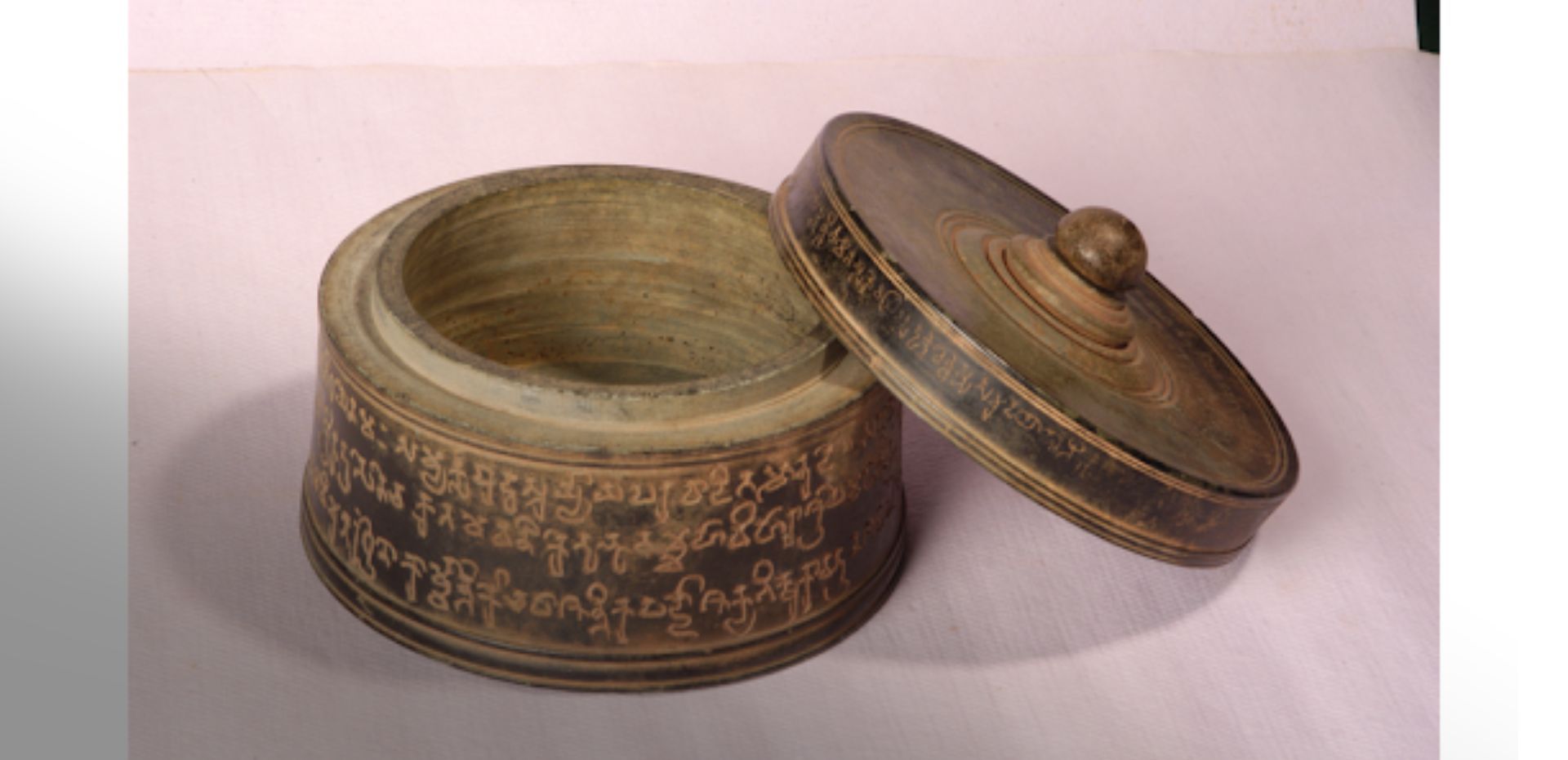 Within the stupa, the archaeologists found two stone reliquaries, one of which appears semi-finished and has only ash and earth in it. The second one, which is made of steatite and bears three inscriptions in 4th century CE Kshatrapa Brahmi script, is exquisitely finished. It had a cylindrical copper jar inside it, a small bottle and fragments of very well-preserved silk cloth. The cloth had been preserved so well due to the copper oxides that resulted from corrosion of the copper within, and thanks to the outer corrosion which sealed the jar. Inside the small bottle was some ash – the sharirika remains.