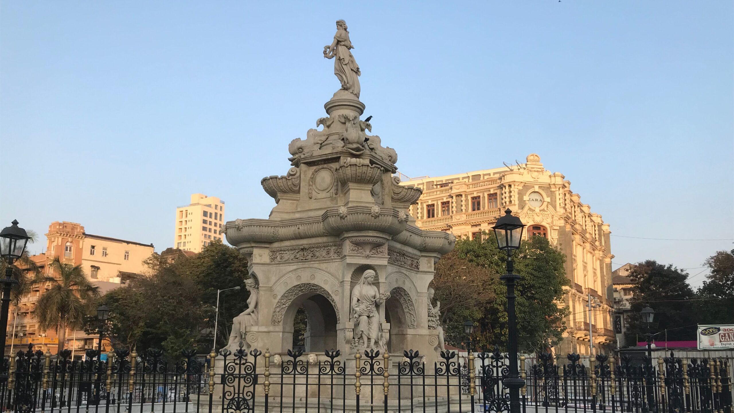 Made of Portland stone imported from England, the fountain is 32 feet tall, including the statue of Flora that crowns the monument. Its design is influenced by Neo-Gothic and Indo-Saracenic architectural styles and boasts beautifully carved sculptures all over. At Flora’s feet are four fishes and there are 20 lion heads placed all over the fountain. The base of the fountain has four sculptures, one in each corner of the monument. These sculptures represent India’s cereal and plant foods, in keeping with the theme of ‘abundance’.