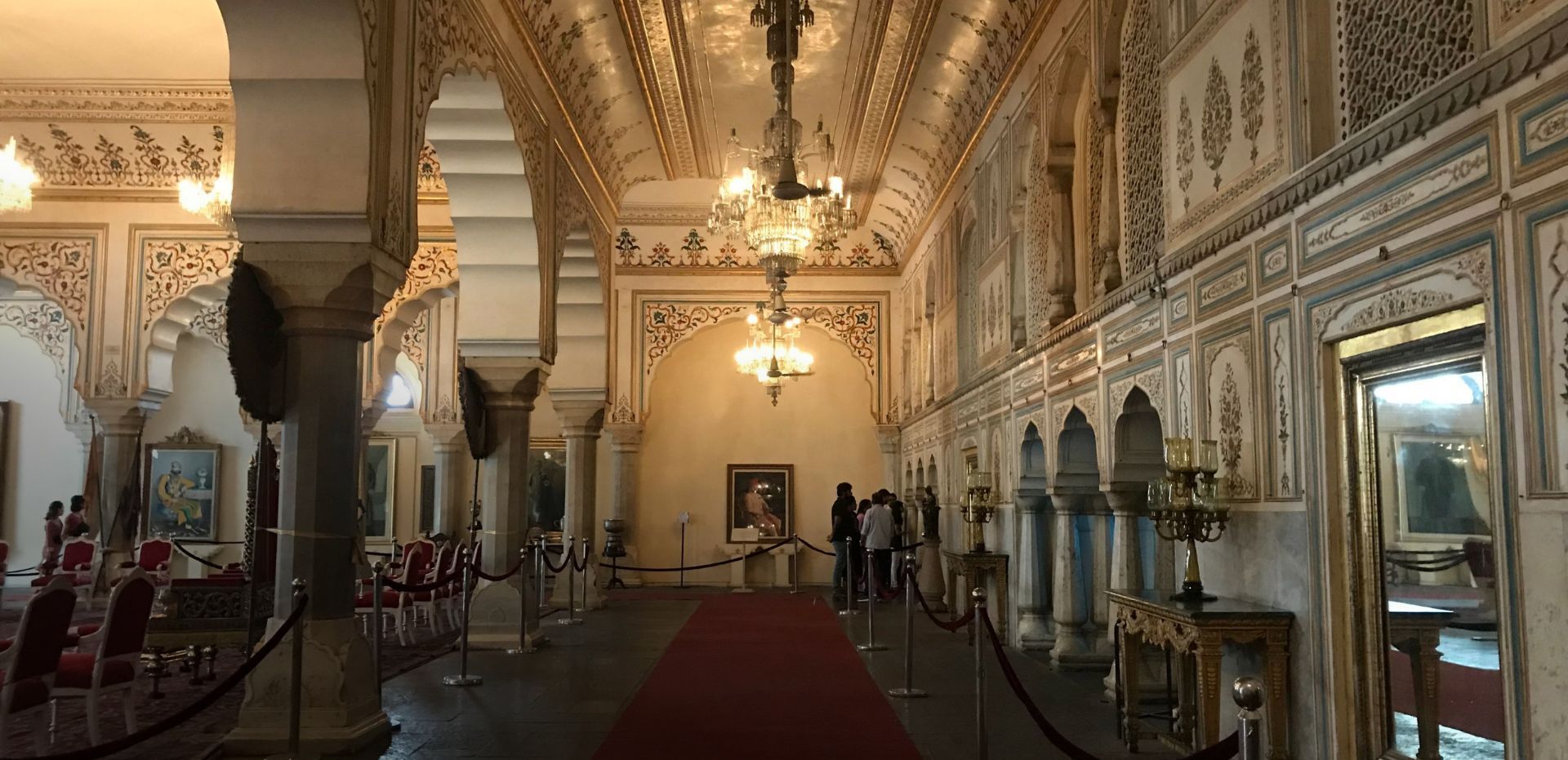 Once the administrative functions moved to the Town Hall (and later to the Secretariat), and the museum was set up, the Sabha Niwas was used as an art gallery for many years. In its present avatar, the room is set up as a durbar hall with thrones, and the walls have large portraits of the Jaipur Maharajas, made by Sahib Ram, one of the greatest artists of the Jaipur court.
