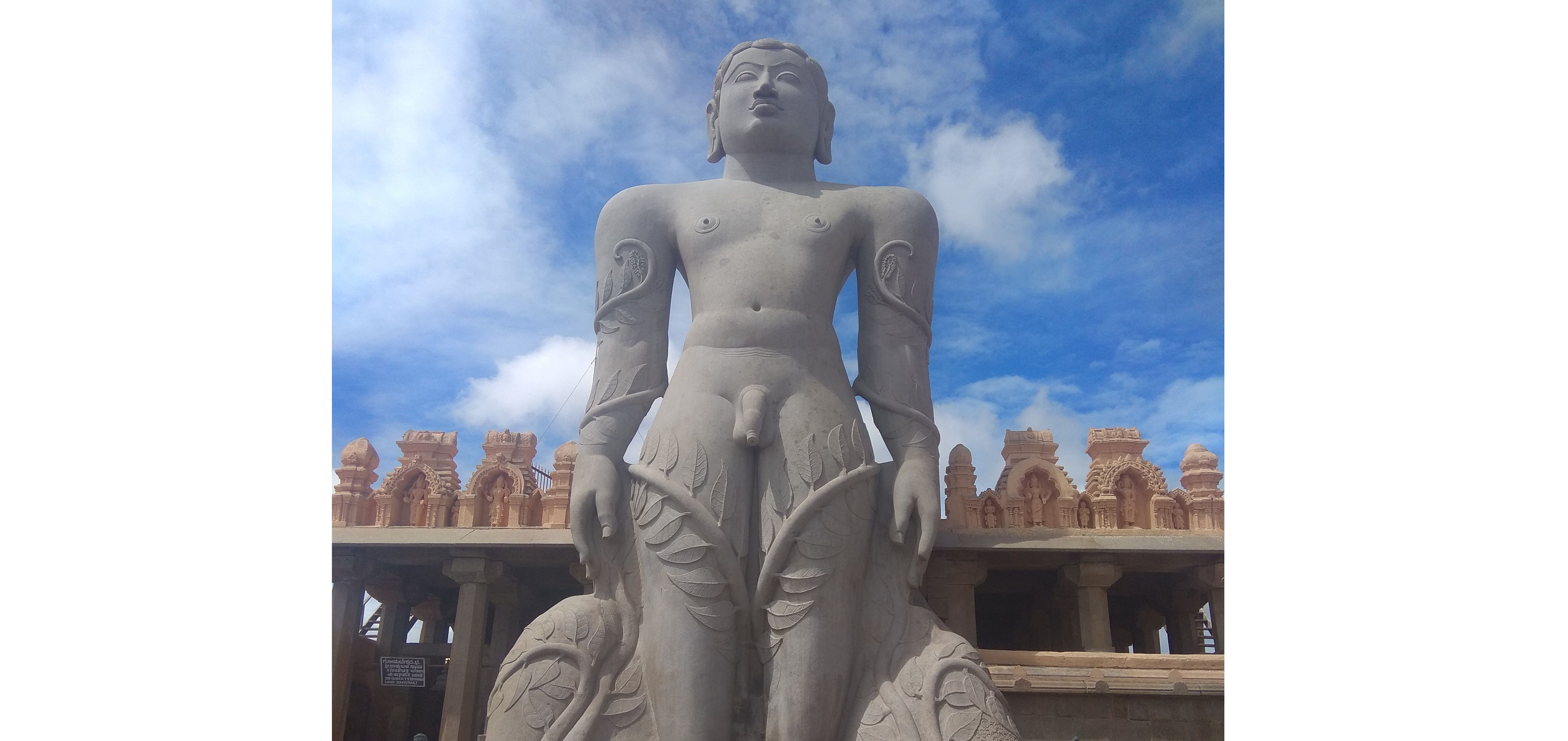 The statue of Bahubali on the Vindhyagiri hill, sculpted in light grey, polished granite, is extremely important for practising Jains. He is depicted with stiff arms and legs in Kayotasarga posture with his arms not touching his body. He has the lakshanas (symbols) of a mahapurusha (great man) like elongated earlobes and overly long arms.