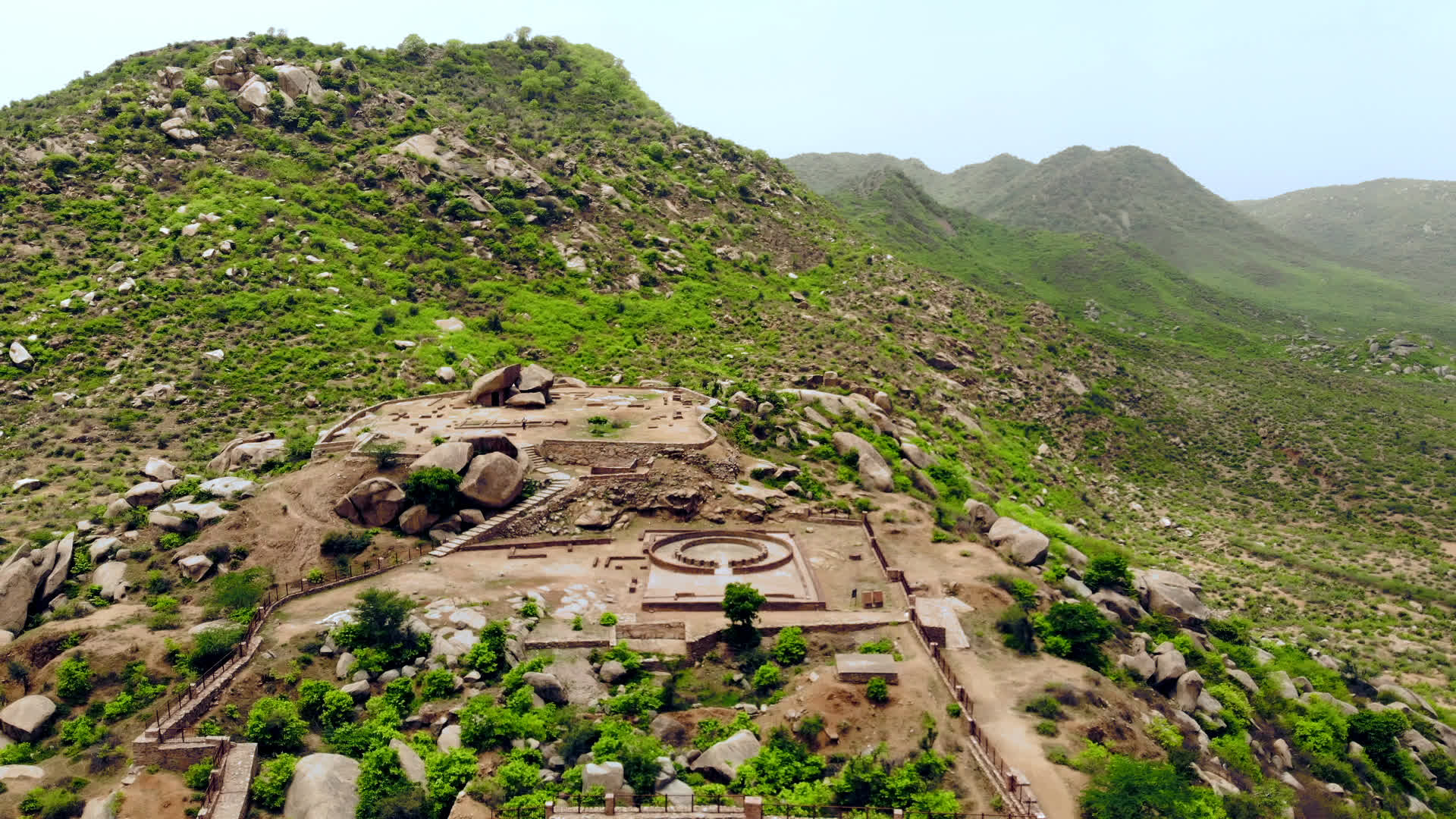 On top of the Bijak-ki-Pahadi are the remains of a Buddhist stupa and a monastery spread across two large platforms connected by stairs. On the upper platform was the monastery, where remains of cells for monks can be seen. On the lower platform was a circular Buddhist chaityagirha or prayer hall with a stupa at its centre, believed to be the oldest of its kind found in India. Interestingly, a number of iron and copper objects found in the excavations here led archaeologists to believe that a foundry was also located at the site, to make objects of use for the occupants of the monastery.