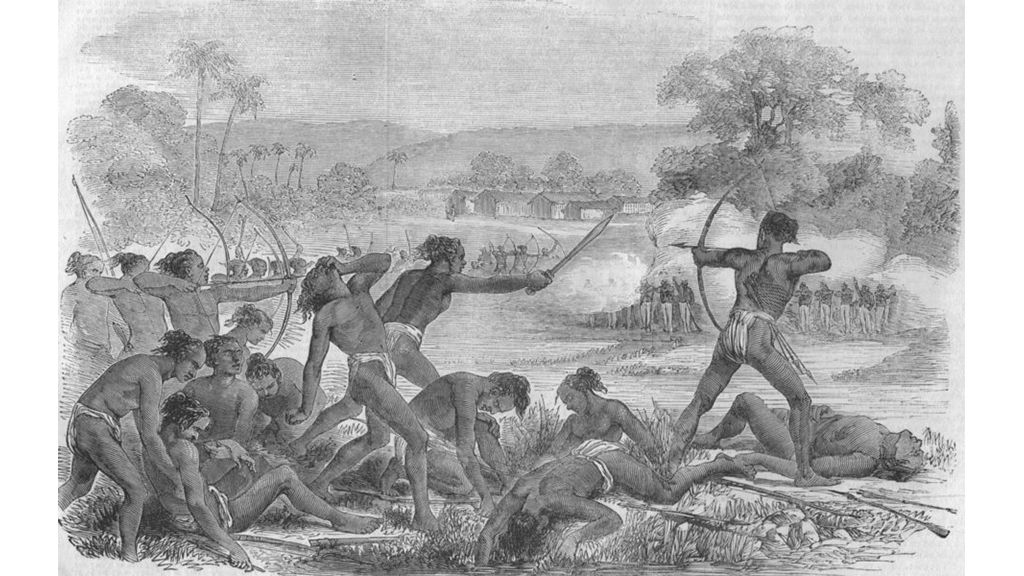 COVER IMAGE: Attack by 600 Santhals upon a party of 50 sepoys, 40th regiment native infantry. (Wiki Commons)